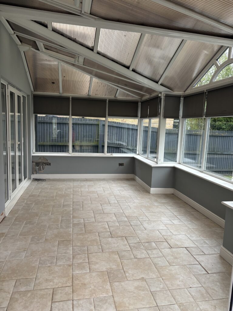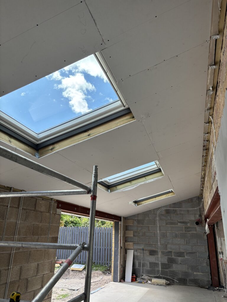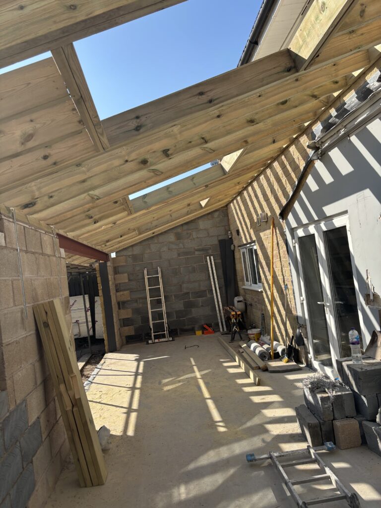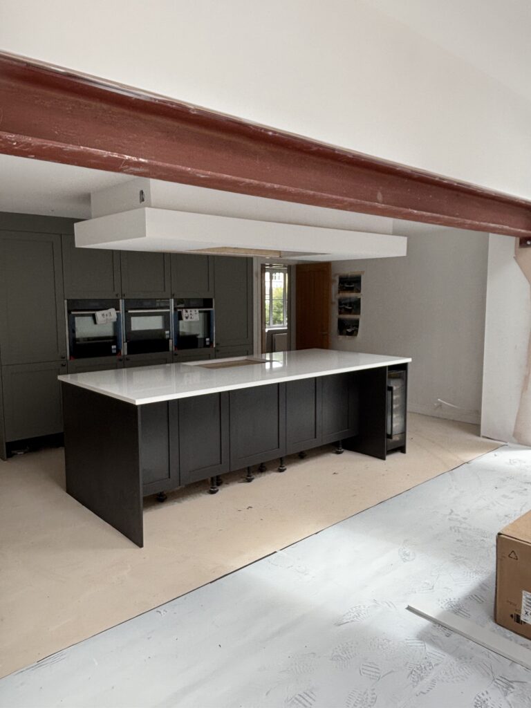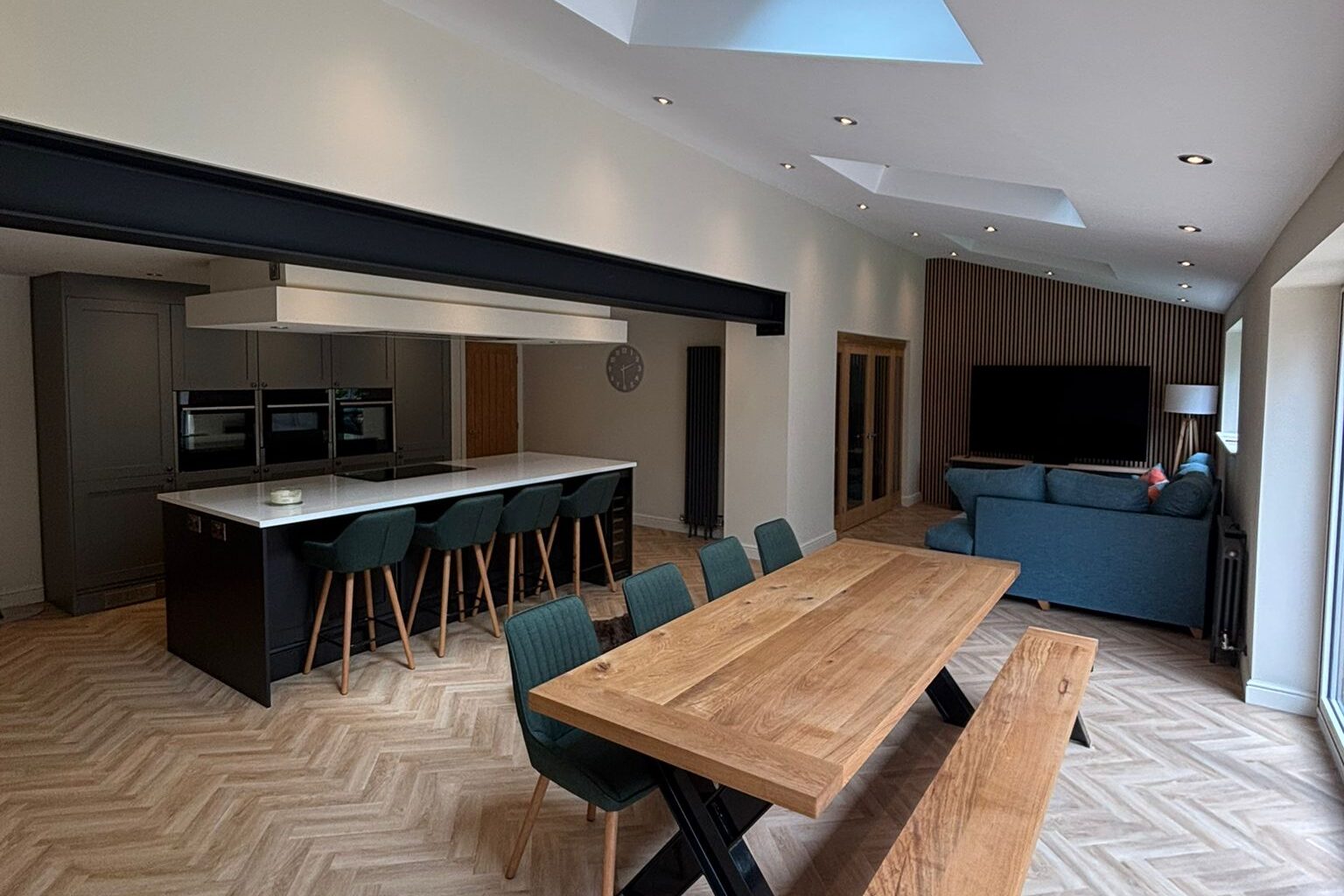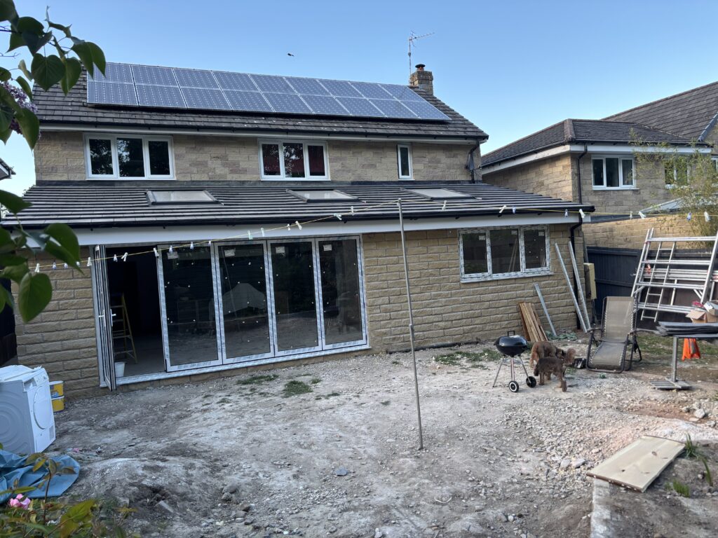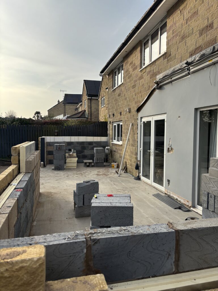 The project involved a wide range of services, including steel work, building and plastering, joinery, plumbing, a brand new kitchen, new flooring, garden landscaping as well as painting and decorating. The goal was to extend the existing kitchen into a modern open plan kitchen, dining and family room with bifold doors opening into a beautiful patio, garden area.